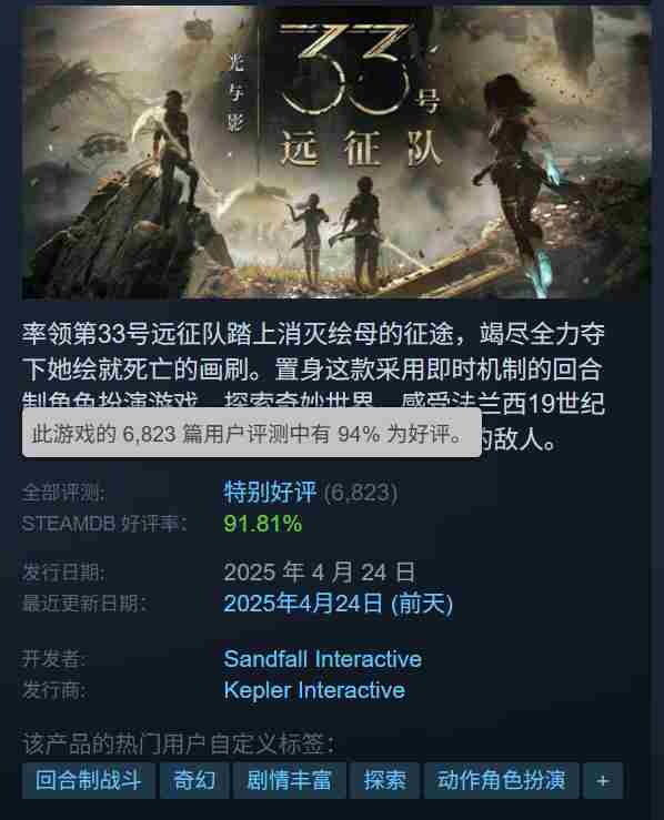 截稿之前,《光与影:33号远征队》在Steam平台为全部评测为"特别好评",6823条用户评测中,好评率高达94%。给出好评的玩家表示,本作的剧情设定极具吸引力,战斗系统融合了即时动作与回合制指令,玩法上充满趣味。画风唯美,演出与打击感表现出色,整体体验超越了传统的JRPG。