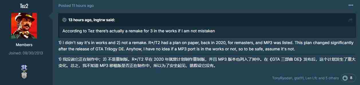 "需要澄清的是,我从未说过《马克思佩恩3》正在重制,而且该项目原本也并非重制版。"Tez2解释道,"Rockstar/Take-Two在2020年确实制定了包含《马克思佩恩3》在内的重制计划,但《GTA三部曲》终极版发售后,整个计划发生了重大改变。目前我无法确认《马克思佩恩3》移植版是否仍在开发中,建议玩家不要抱太大期望。"