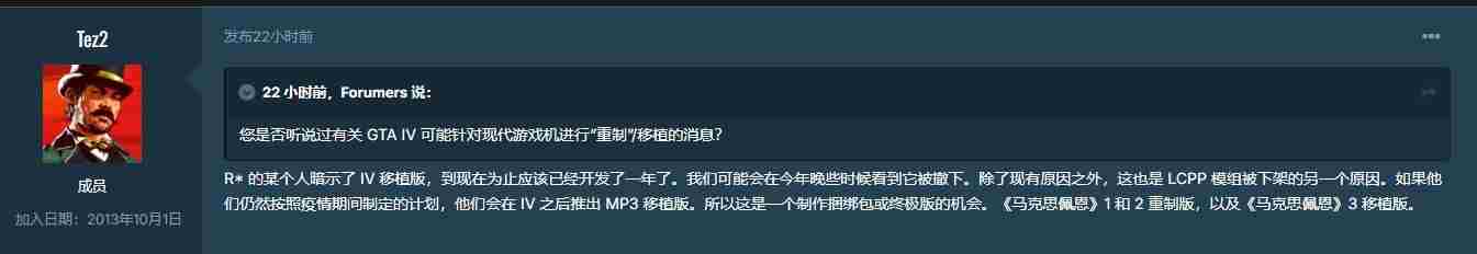 Tez2此前曾表示,若按疫情期间制定的原计划执行,Rockstar将在2024年启动《GTA4》移植项目,随后还将推出《马克思佩恩3》的移植版本。然而在5月22日的最新爆料中,Tez2指出当前计划已与2020年的最初设想大不相同。