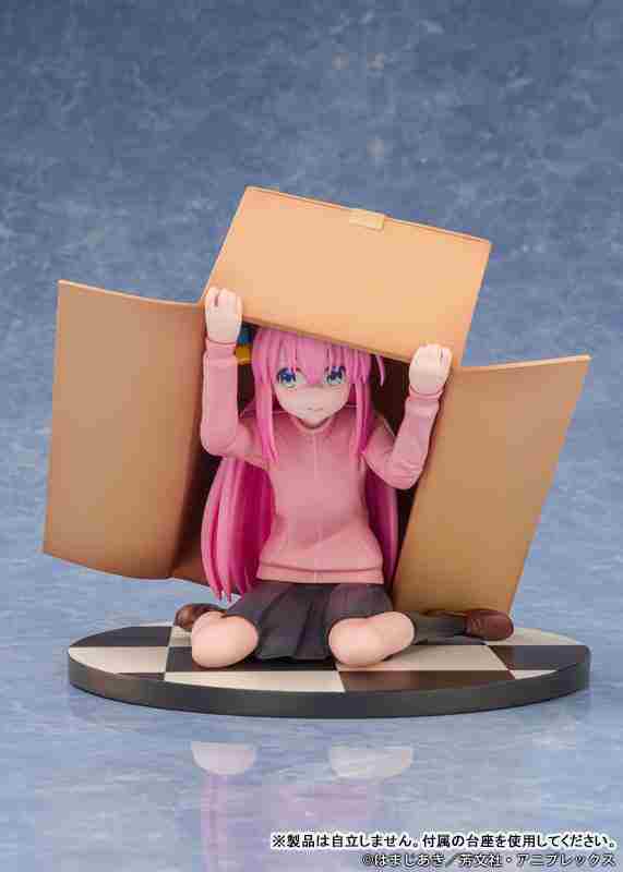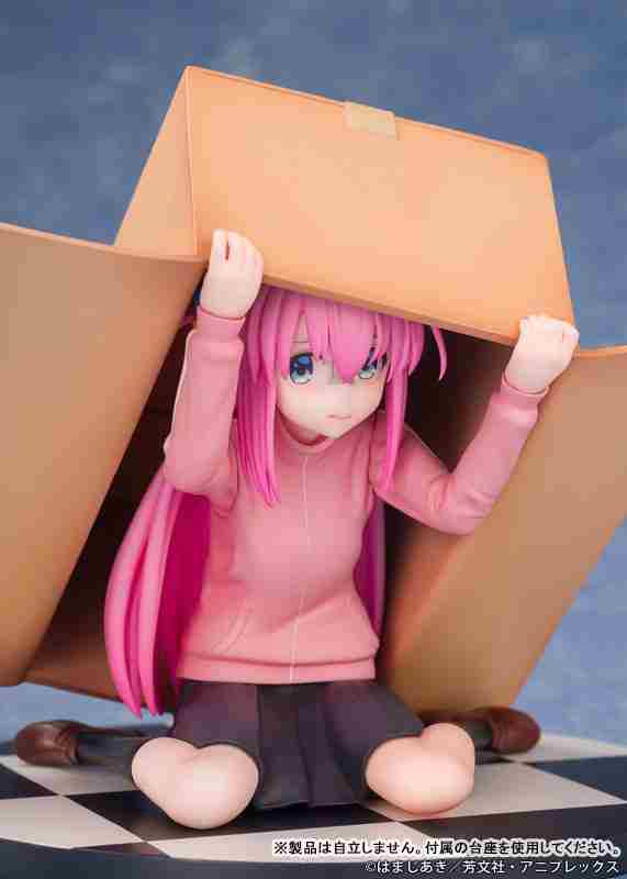 这款模型高约16厘米,采用环保材质制作,确保安全与品质。模型的设计团队在细节刻画上花费了巨大心思,真实还原了后藤一里蜷缩在纸箱中的姿态。特别是那件标志性的粉色运动外套的皱褶,以及透过纸箱缝隙窥视的忐忑眼神,都让人感受到角色特有的“社恐”气质。从微微发抖的手指到紧绷的肢体语言,这些细腻之处让模型显得栩栩如生,仿佛能够传达出后藤一里的内心情感。
