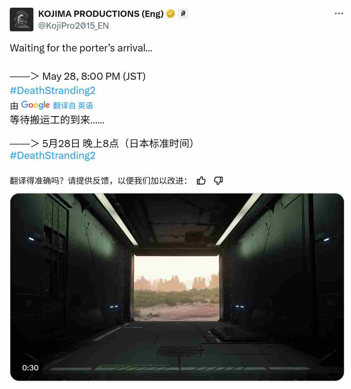 今日,小岛秀夫领衔的小岛工作室官方推特发布了一则激动人心的消息《死亡搁浅2》将于5月28日晚7点举办特别发布活动。预告中等待搬运工的到来字眼激发玩家无限遐想。鉴于游戏定于6月26日登陆PS5,预计活动将揭晓全新预告片,令人翘首以待。