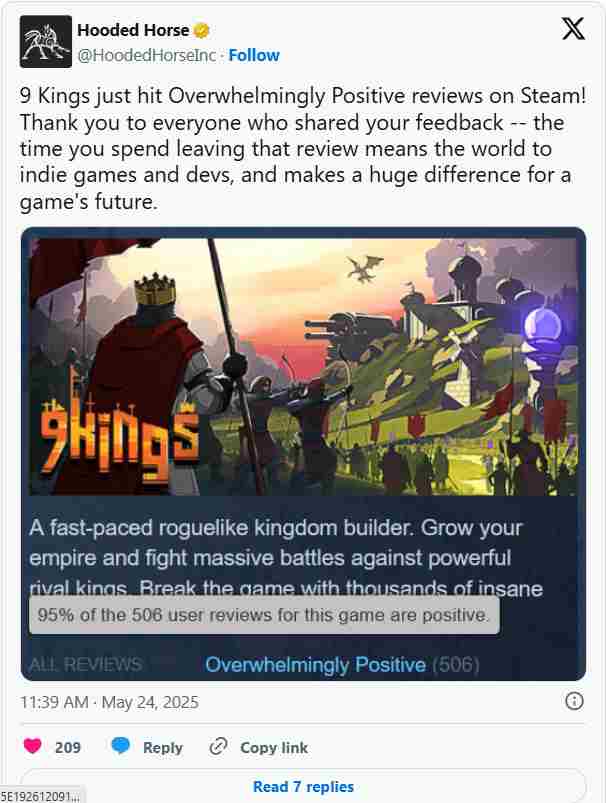 备受玩家期待的《九王》(9 Kings)已于5月23日在Steam平台启动抢先体验,短短五天内便获得2000余条特别好评。Sad Socket团队与Hooded Horse及INSTINCT3联手打造,带来中文支持的高品质游戏体验。立刻加入,感受王的荣耀!
