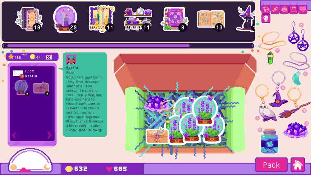 除了丰富的贴纸内容,《暗影之书》还引入了8件全新神秘好物,比如精致的水晶和魔法钥匙扣,为商品的包装增添了更多惊喜。玩家可以将这些小物品与他们制作的贴纸一同包装成神秘礼品,吸引顾客前来购买。并且,DLC还带来了六种全新的闪光纸,赋予玩家的“咒语创作”额外的璀璨星光,让每一张贴纸都熠熠生辉。