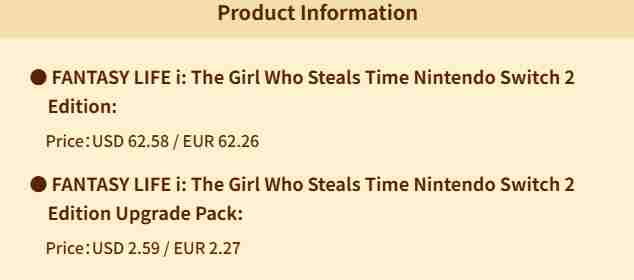 《幻想生活i 转圈圈的龙和偷取时间的少女 》Switch2版售价62.58 美元,对于已经拥有Switch版的玩家只需花费 2.59 美元或 2.27 欧元购买升级包,即可升级至Switch 2版本。