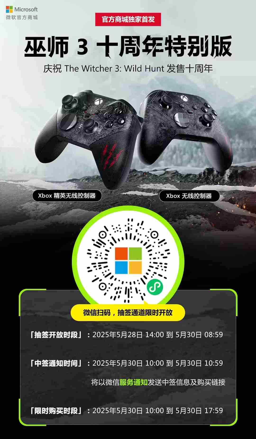 微软刚刚宣布,《巫师 3》十周年特别版 Xbox 无线控制器、Xbox 精英无线控制器将于 5 月 28 日下午 14:00 点开放抽签,普通版限量 125 台,精英版限量 100 台,国行价格似乎只对中签者公布。