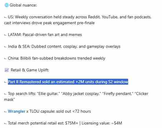 曾获“网络奥斯卡”威比奖(Webby Award)的电影市场分析师Chris Colombo最近在领英(LinkedIn)上分享了一些关于《最后生还者》IP的数据,除了第二部游戏售出200万份外,第二季电视剧吸引了2000万独立观众。此外,据估计,该剧带来了7200万美元的订阅用户价值,以及额外1750万美元的广告套餐模式收入。而且在游戏方面,在第一季首播期间,两款游戏的玩家数量都出现了约1000%的激增。