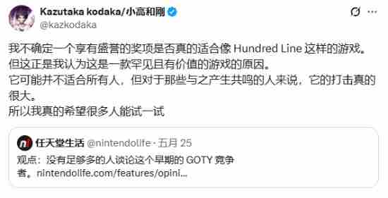 “我不确定这样一个享有盛誉的奖项是否真的适合像《百日战纪》这样的游戏,但这正是我认为这款游戏罕见且有价值的原因。它可能并不适合所有人,但对于那些能够产生共鸣的人来说,它真的可以击中你的心,所以我真的希望更多人能试一试。”