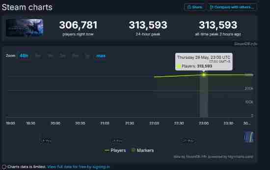 根据SteamDB数据显示,本作在Steam平台的在线人数峰值已经突破了31万人!截止至发稿时仍有超过30万人正在游戏中!