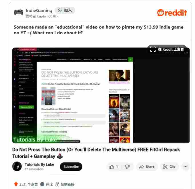 发帖者开发的游戏《本游戏与大红按钮无关》刚刚于4月17日登陆Steam正式推出,虽然褒贬不一,不过居然也被盯上了,开发者在论坛发帖,称发现了盗版,而且还被制作了引导下载的说明视频发到油管上去了。