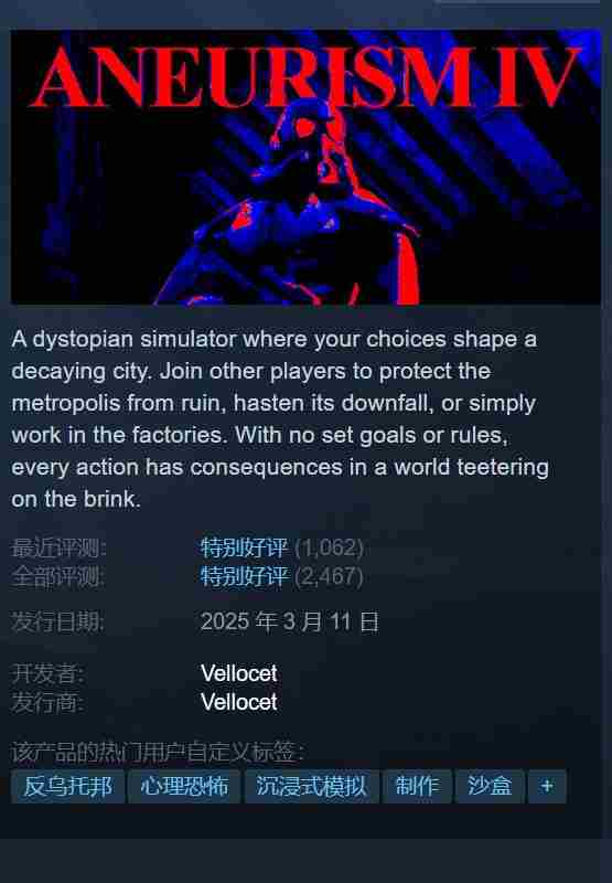 祖科夫斯基强调,Steam的独特之处在于其算法能够持续支持不同规模、类型和品质的游戏。许多未被媒体发现的“奇怪”作品,如反乌托邦模拟游戏《Aneurism IV》,仍能通过平台的自然流量积累数千条好评,为开发者创造数十万美元收入。这种生态的多样性证明,Steam仍是目前最优质的游戏发行平台之一。