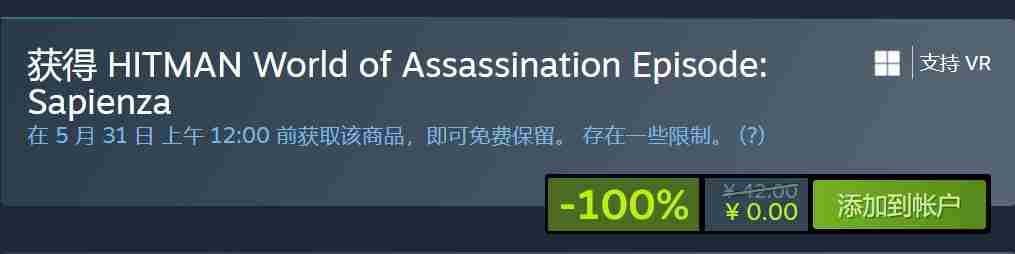 好消息!Steam平台目前免费赠送《杀手暗杀世界》的萨比恩撒版本,价值42元,限时抢购截止至2025年5月31日。立刻登录账户,轻松点击添加到账户,享受序章与6个经典任务。游戏支持简体中文,机会难得,不要错过!