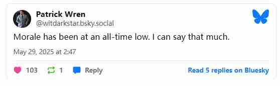 随着《黑豹》游戏项目的取消和Cliffhanger Games工作室的 shutdown,曾在《星球大战绝地幸存者》中担任高级遭遇战设计师的帕特里克·雷恩在BlueSky社交媒体上透露,Respawn Entertainment工作室的士气受到了严重影响。
