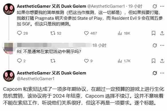 对此,Dusk Golem解释称:“卡普空和索尼达成了一项多年期协议,为超过一定预算的《生化危机》游戏宣发。该协议于2024年到期后,卡普空选择不再续约。但这不意味着《生化危机》不能再登索尼发布会,听说他们关系依然很好,只是不再强制要求。”