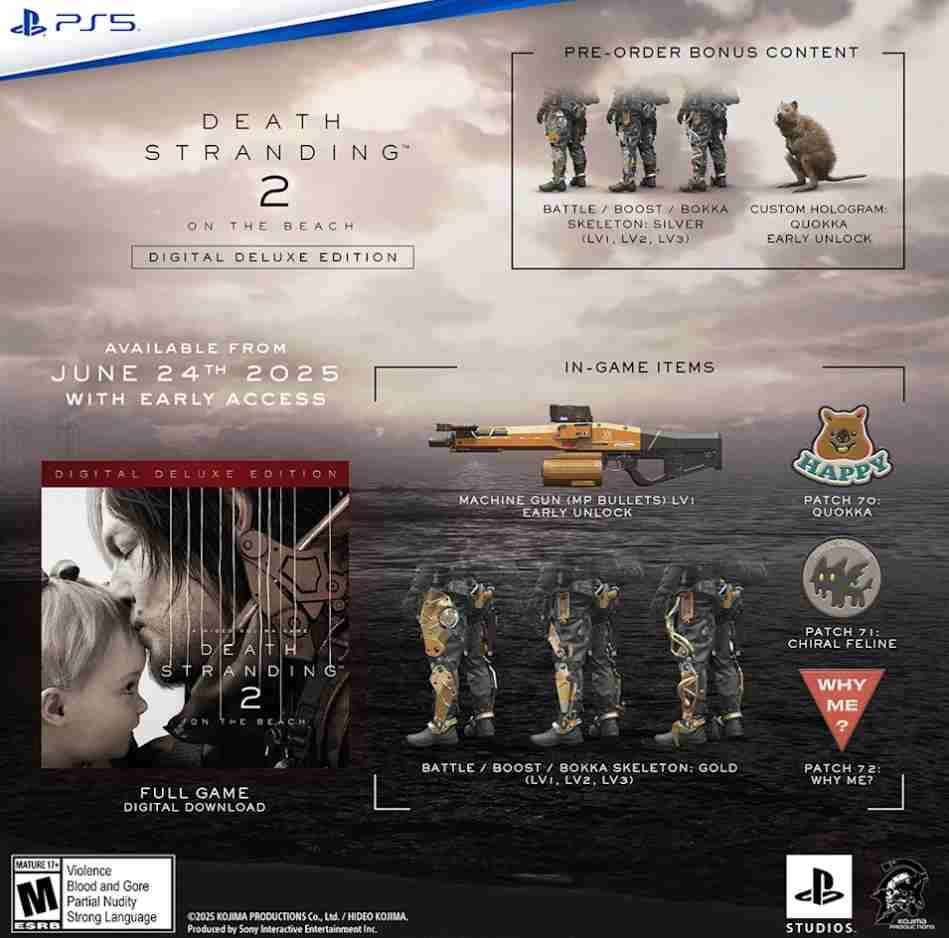 《死亡搁浅2:冥滩之上》将于6月26日在PS5平台发售。预购即可获得:自定义全息投影短尾矮袋鼠、战斗骨架:银(Lv.1)(Lv.2)(Lv.3)、强化骨架:银(Lv.1)(Lv.2)(Lv.3)、步荷骨架:银(Lv.1)(Lv.2)(Lv.3)。豪华版除了前述物品外,还包含机关枪[MP](Lv.1)提前解锁、短尾矮袋鼠、开若尔猫科动物和"为何偏偏是我?"布章。