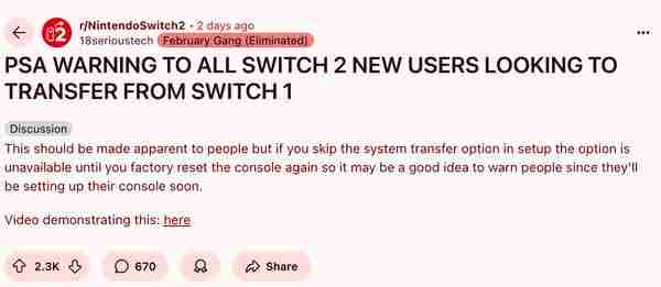 知名YouTube频道SwitchForce分享了亲身经历的惨痛教训:他们在首次设置Switch 2时选择跳过数据转移,事后想重新操作却发现系统已关闭该功能,只能通过"完全恢复出厂设置"才能重新开启转移流程。但这种方法会清除新主机所有数据,包括已下载游戏、截图、视频及其他未备份内容。