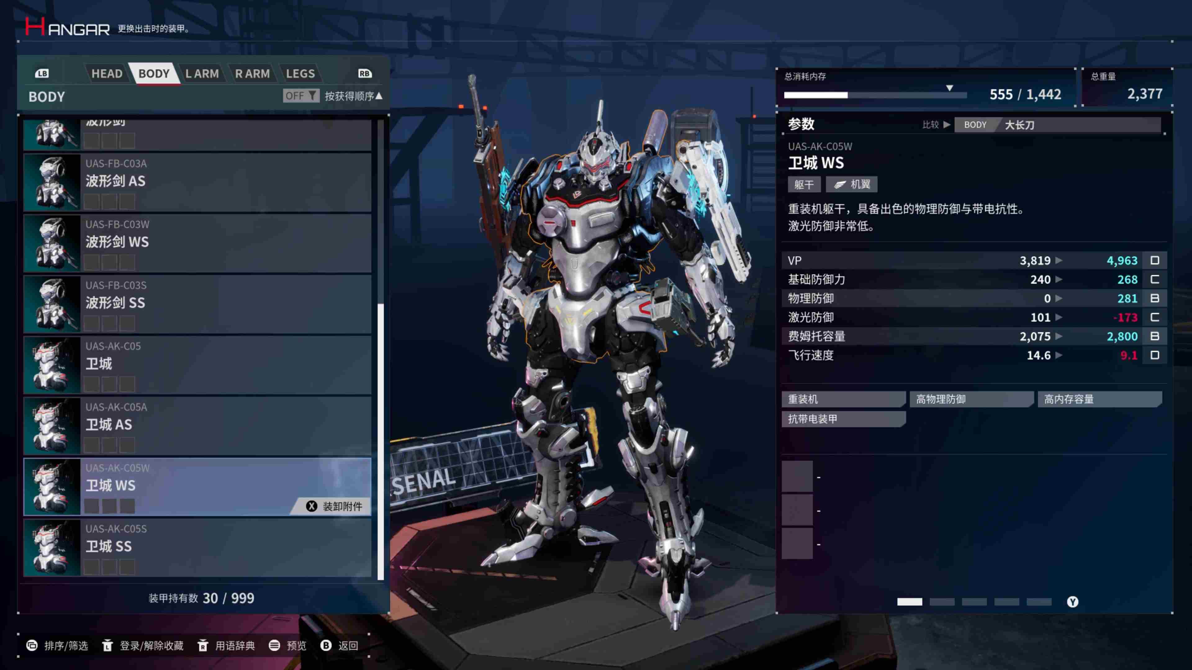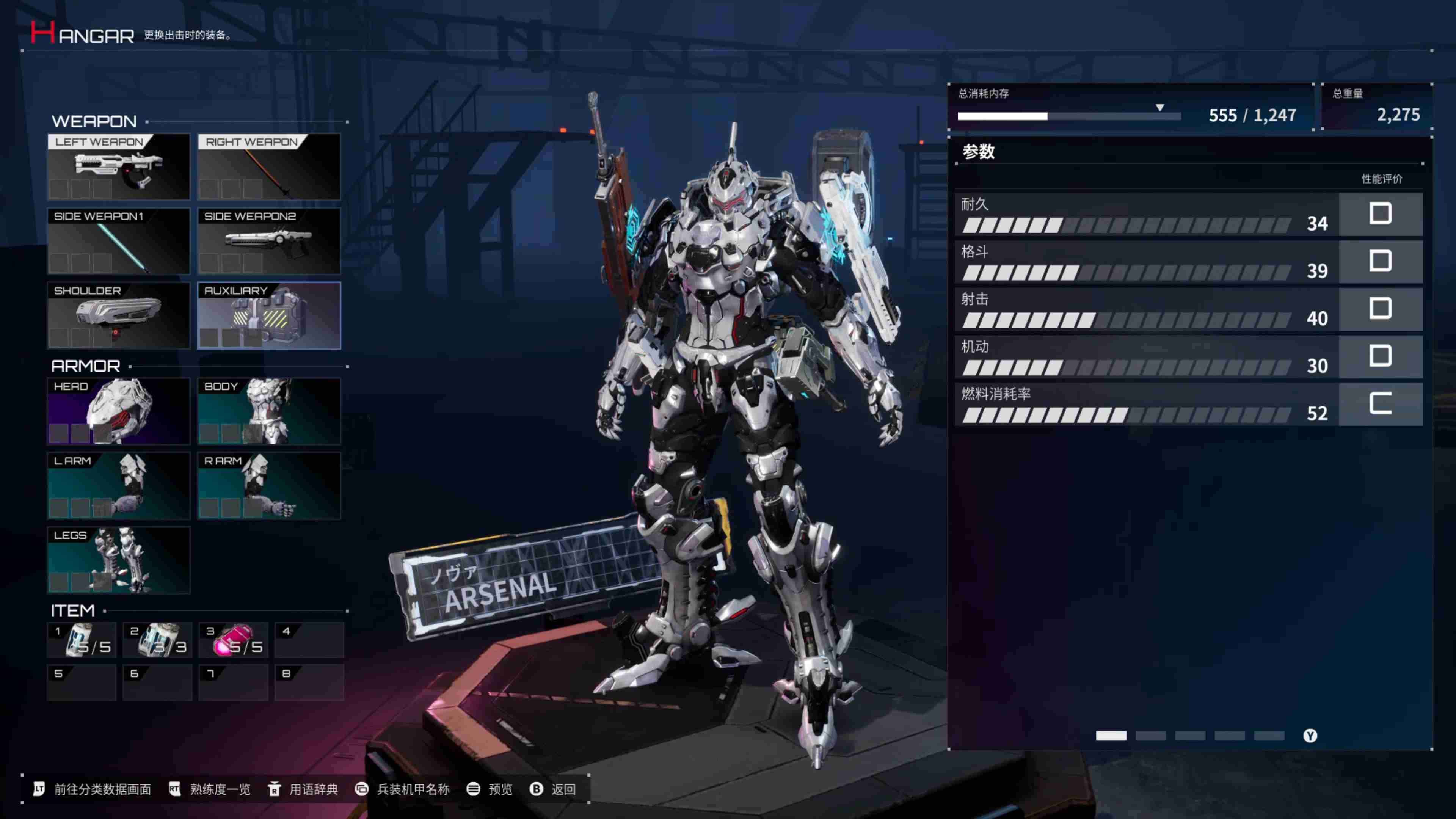机甲改装由三部分组成——武器、装甲以及道具。大体上看,《神话之裔》的改装系统和前作区别不大,但实际进入到改装页面后可以发现,游戏内的各种装备组件性能有了更加清晰的条目区分和数值量化,玩家能够更直观地进行组件之间的性能对比,进而挑选出最佳部件。