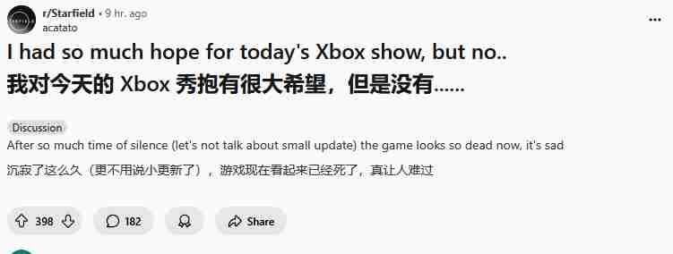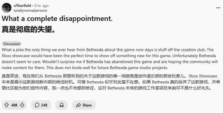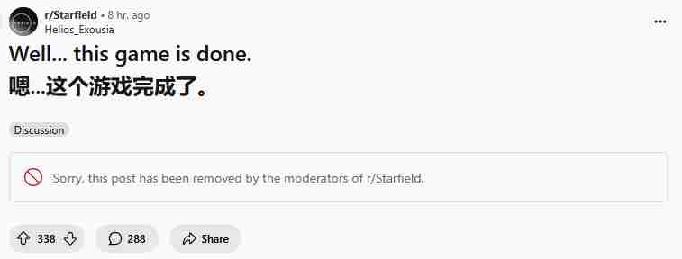在《星空》Reddit社区中,一篇题为《好吧...游戏已经到头了》的讨论帖迅速获得数百互动,但很快遭到删除。而诸如《真是彻底失望了》《我本来对Xbox寄予厚望,但结果却…》等帖子则得以保留,这或许反映了版主对玩家情绪的妥协:社区的不满情绪确实需要宣泄渠道。