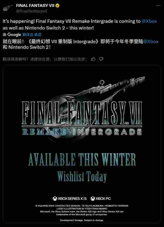 尽管官方在预告片中仅展示了Xbox的logo,但在随后发布的动态中表示《最终幻想7:重制版Intergrade》还将在今年冬季同步登陆Nintendo Switch 2!