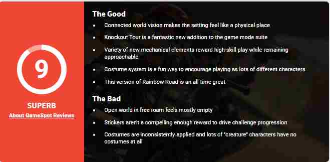评测者表示,《马里奥赛车世界》是一款规模宏大、内容丰富的续作,它巧妙地拓展并深化了《马里奥赛车 8 豪华版》那些成就其长久成功的特质。这是一款极其有趣且令人满足的卡丁车竞速游戏,易于上手,同时又具备足够的机制深度,足以让资深卡丁车玩家感到满意。