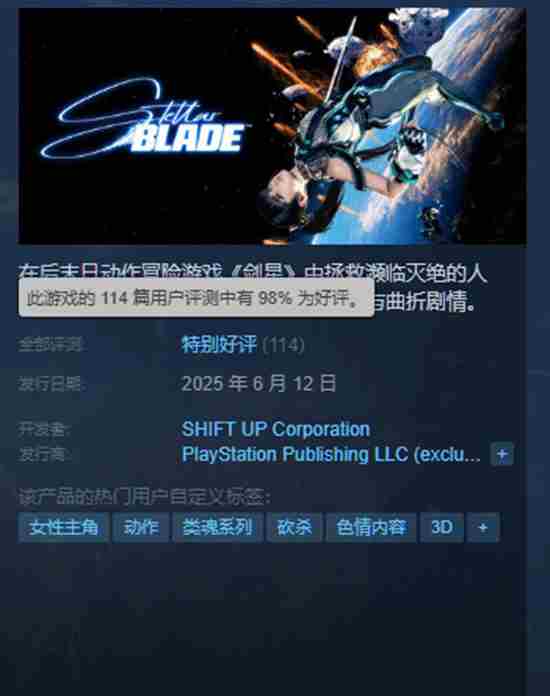 这款联动DLC诚意满满,带来了多套极具特色的联动服装。不仅如此,此前与《尼尔:机械纪元》的联动内容也一并包含其中,让玩家一次体验到双重惊喜。截至目前,在Steam商城,《剑星》已收获114条评测,好评率高达98%,获得了“特别好评”的佳绩。