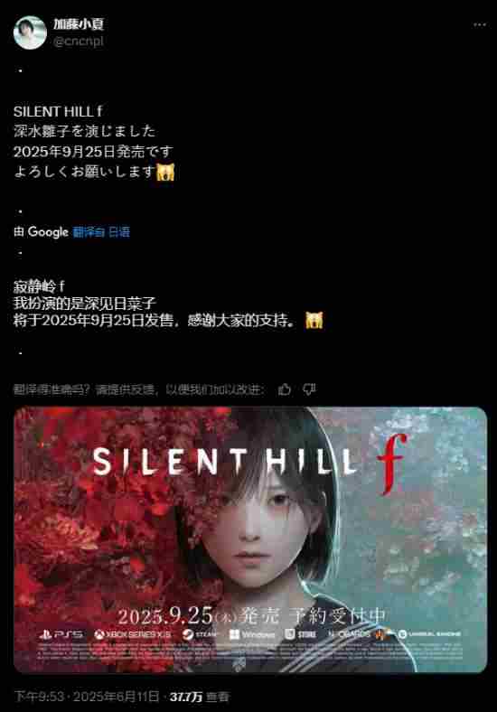 今日,加藤小夏于官方推特发文宣传游戏:“我在《寂静岭f》中出演深水雏子,游戏将于9月25日发售,感谢大家的支持”这条推文迅速获得上万点赞,玩家们纷纷留言表示对这位新演员的期待。