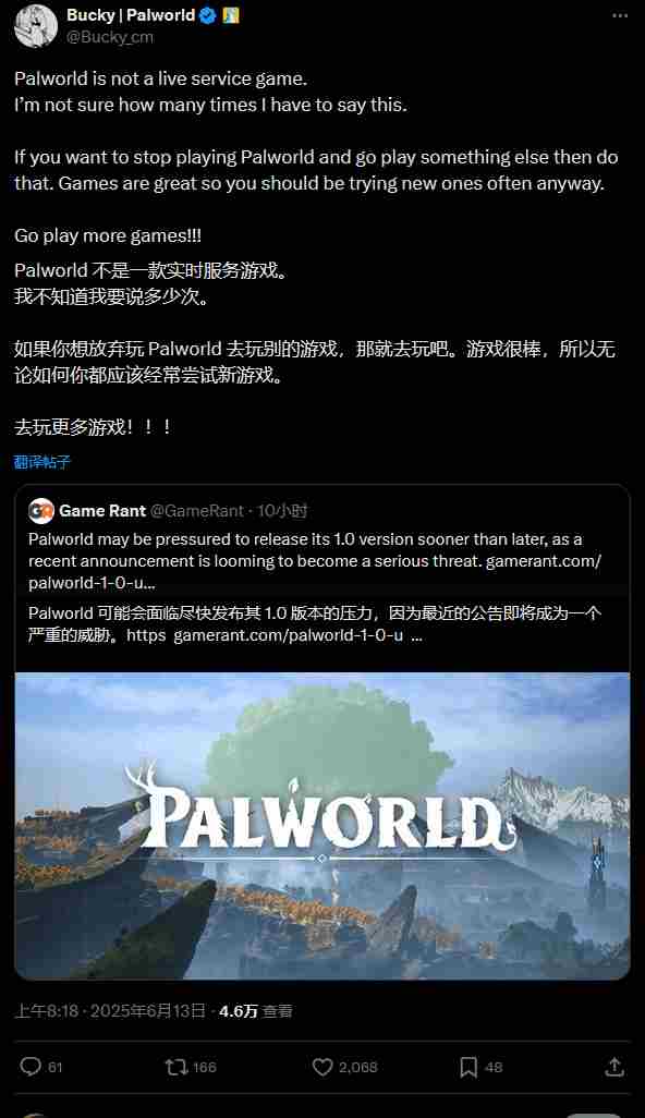 对此,《幻兽帕鲁》的公关总监兼发行经理在社交媒体上作出回应,强调该游戏并非在线服务型产品,因此玩家若选择转向其他游戏,开发团队持开放态度。他表示:“《幻兽帕鲁》并不是一款在线服务型游戏,因此如果玩家想放弃《幻兽帕鲁》去玩别的游戏,那就去吧。”