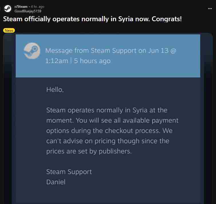 多位叙利亚玩家证实已收到Steam客服的官方邮件确认:"Steam目前在叙利亚已正常运营。在结账过程中,您将看到所有可用的支付选项。我们无法对游戏定价做出说明,因为价格是由发行商自行设定的。"