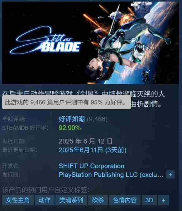 此外,根据Steamdb的数据显示,《剑星》PC版的最高同时在线人数曾达到183,830人,外媒预测该数据在周末可能会进一步攀升。截稿之前,本作在Steam平台的全部评测为“好评如潮”,9466条用户评测中,好评率高达95%。