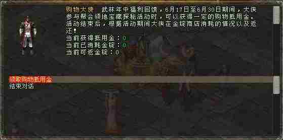 6月17日-6月30日,大侠于金锭商店(包括618狂欢商店)中消耗的金锭数量将被记录,7月1日-7月7日可于临安城-购物大使处领取购物抵用金,最高返17万金锭!请大侠共赴这难得的江湖盛宴!