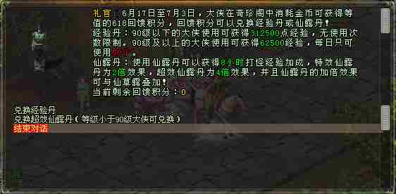 6月17日-7月3日,大侠在奇珍阁消耗金币,可获得等额的618回馈积分,使用回馈积分可于【礼官】-【618回馈】处兑换经验丹(永久绑定)、仙露丹(永久绑定)等道具,大侠挂机升级打宝更轻松!