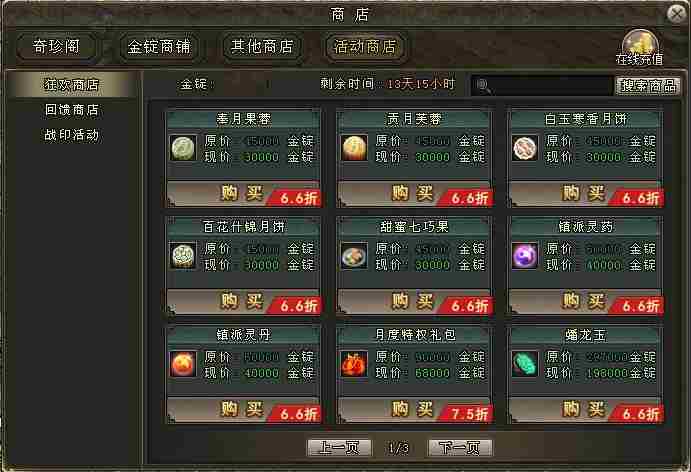 6月17日-7月3日,奇珍阁-将新开618商店,福缘露、门派信物、坐骑易容令牌等珍贵道具限时折扣出售,请大侠更新后前往购买。