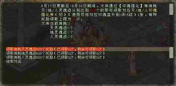 6月17日-6月30日,大侠通过印魂强化功能消耗指定数量的灵魂迹即可到购物大使处领取对应印魂直升券!大侠印魂强化快人一档,笑傲群侠!