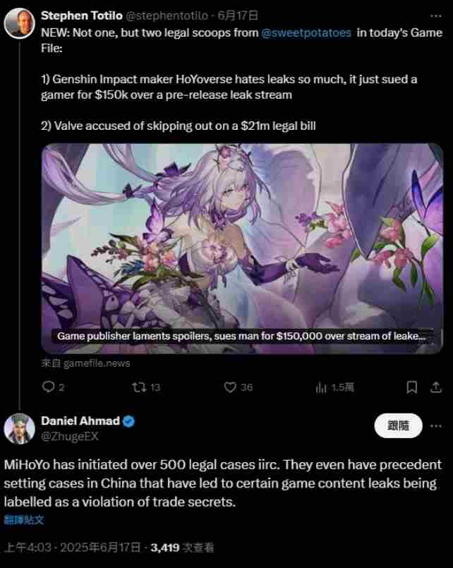 产业分析师Daniel Ahmad透露,米哈游已在全球发起超过500件法律诉讼,部分中国案件更被认定为"侵犯商业秘密"。未来不论是《星穹铁道》、《原神》还是《绝区零》的玩家社区,都可能面临更严格的防泄密措施。