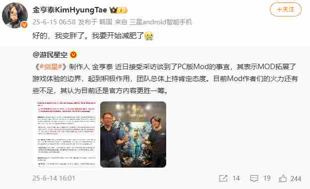 金亨泰近日以《剑星》总监身份接受韩国游戏媒体This is game专访,访谈内容在网络上被广泛传播,特别是他关于"官方比模组更厉害"的言论。然而金亨泰本人关注的焦点却是访谈配图,他在个人微博转发中国相关报道时附上与技术总监李东沂的合照,并配文:"好吧,我变胖了。我要开始减肥了"加上一个苦涩表情。