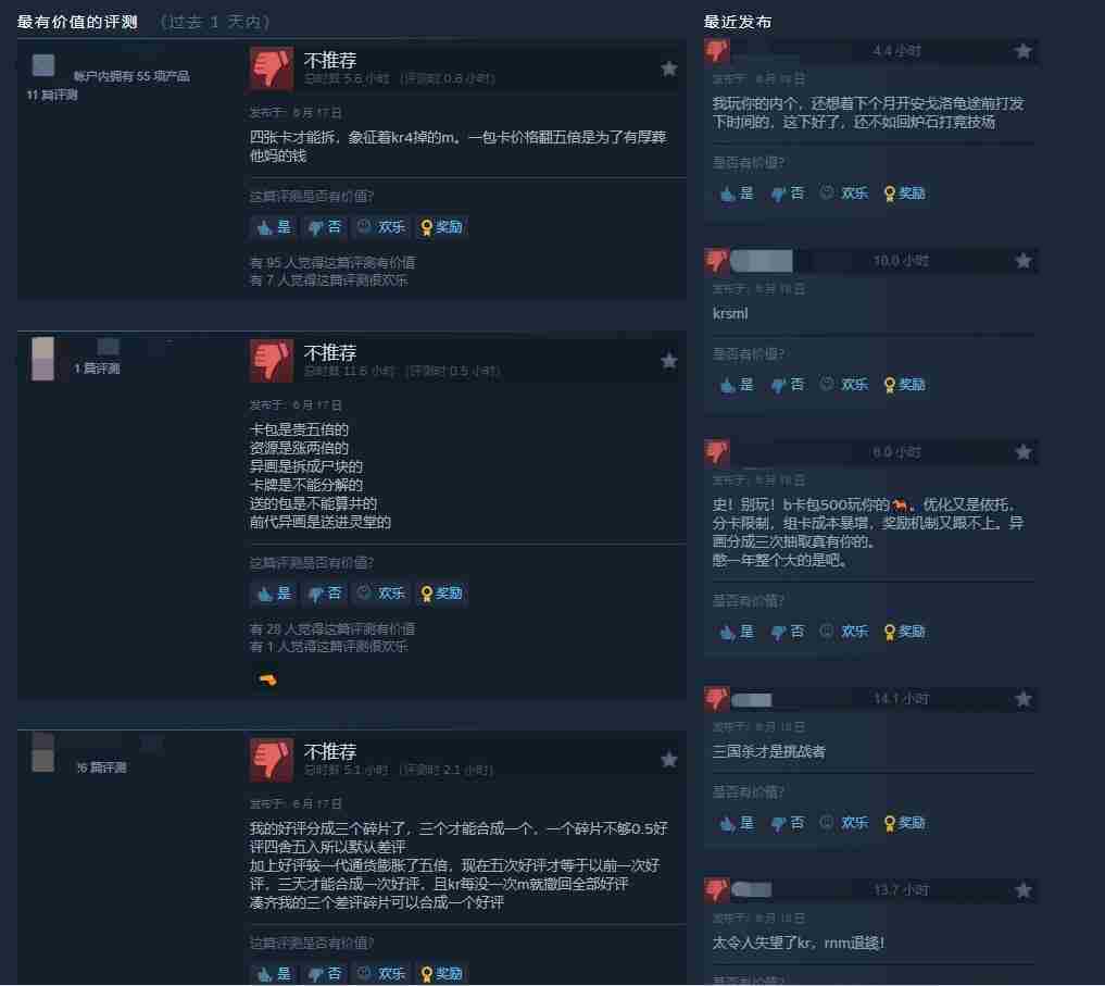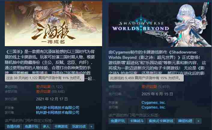 尽管游戏新增了“超进化”机制和社交向的“世界功能”,但Steam版上线后遭遇大规模差评轰炸,首日好评率仅15%,距离三国杀目前的好评率11%仅差四个百分点,颇有动摇其地位之势。
