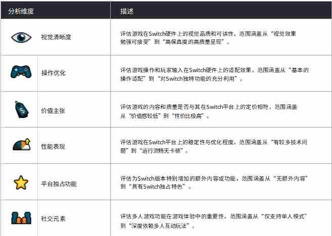 为确定相关因素,我们对Switch移植游戏的正负面评价进行了开放性编码分析,这是一种将数据拆解为更小片段以提炼主题的过程。具体分析维度如下: