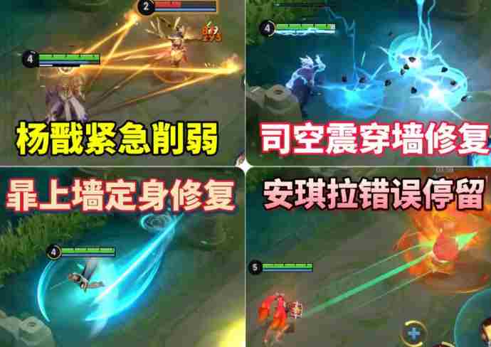 王者荣耀正式服方面,四位英雄终于是调整上线了,分别是杨戬、曹操、暃以及安琪拉。其中,杨戬重做上线之后,就一直处于T0的行列,凭借CD短,伤害高,而且免疫控制等技能的加持,杨戬可以说是对抗路之王了。所以说,王者荣耀对杨戬进行强度削弱,一技能的冷却时间在前期增加哦。另外呢,司空震的穿墙bug,以及1A的普攻消失问题,都将得到修复哈。至于暃上墙定身bug,也是进行了修复,目的是为了更好提升皮肤销量啊。而安琪拉的调整,主要是二技能的停留位置bug,将要得到修复。