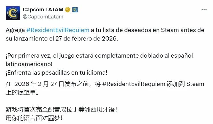 今日,卡普空拉丁美洲官方账号宣布重大消息《生化危机安魂曲》将迎来历史性突破,成为系列首部提供拉丁美洲西班牙语全语音版本的游戏。这一举措无疑将为当地玩家带来更加沉浸式的游戏体验。