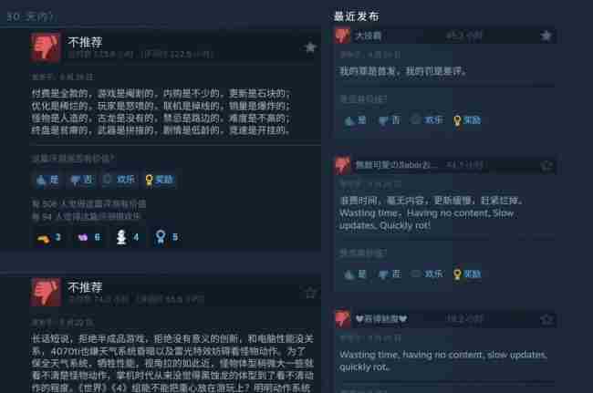 除了在线人数持续下滑,《荒野》的口碑同样出现剧烈波动。在过去一个月,该作在Steam上的好评率仅为19%,整体评价已跌至“差评如潮”。对比之下,《怪物猎人:世界》在同一时间段的好评率高达89%,维持在“特别好评”的区间。这种差距也从侧面反映出玩家对《荒野》的失望情绪正加剧蔓延。