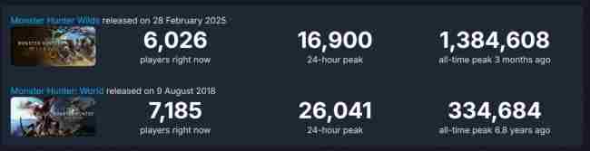 当前,《怪物猎人:荒野》不仅在线玩家数被前作《怪物猎人:世界》反超,甚至在评价体系上也遭遇“滑铁卢”。根据Steam数据显示,《荒野》当前在线人数仅为6026人,而2018年发布的《世界》则有7185人在线。若从24小时峰值来看,《荒野》也仅有16900人,远低于《世界》的26041人。这种颠倒式反差,令不少玩家和业内人士感到意外。