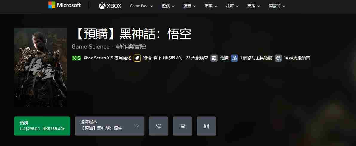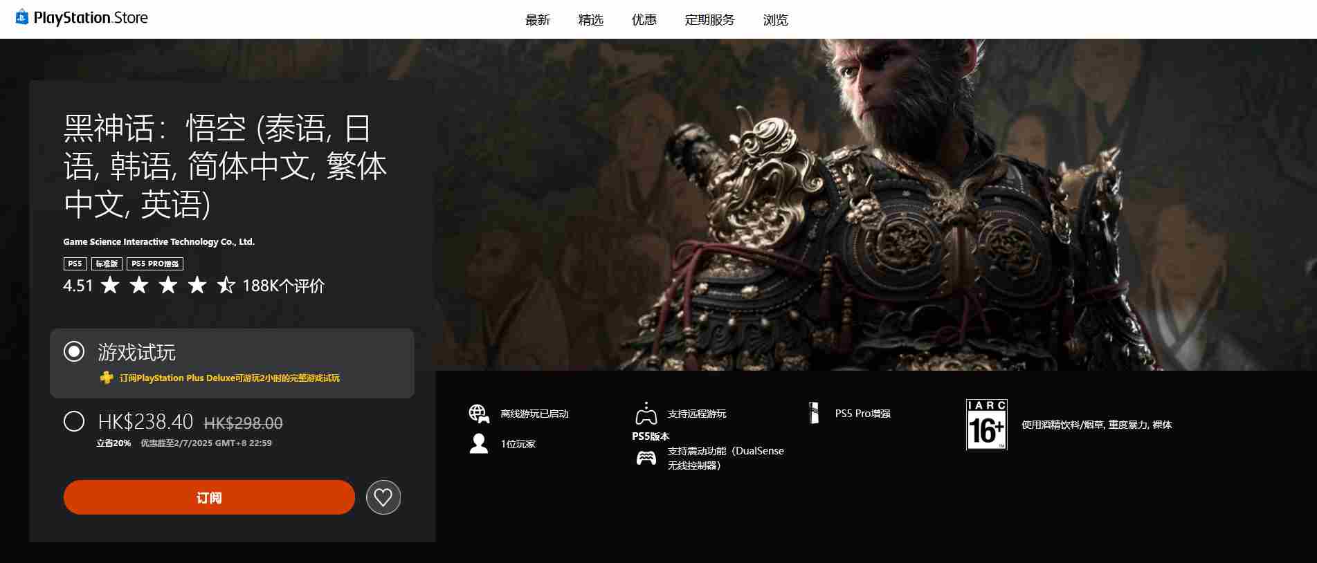 此前,《黑神话:悟空》数字版也已在PS及Xbox平台开启首次促销活动,原价298港币,现价238.4港币。 PS Store活动时间为6月18日 - 7月3日,微软商店活动时间为6月18日0时 - 7月11日0时。 感兴趣的玩家千万不要错过。