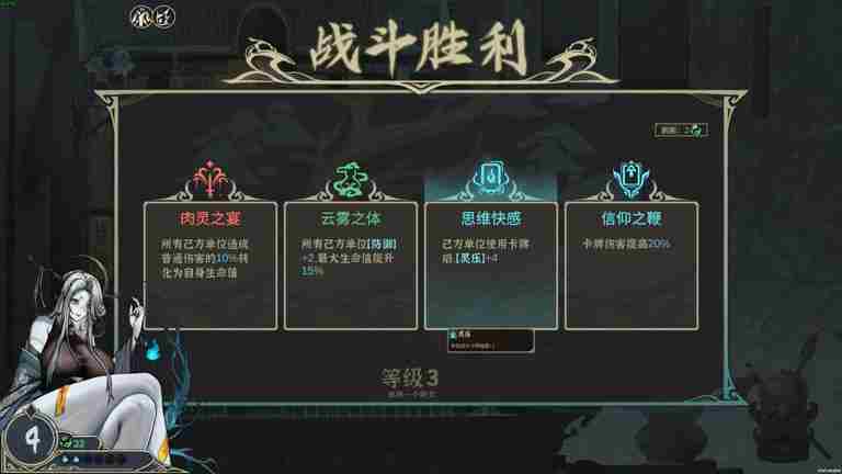 铺场站场,阴文里的愉悦:每次胜利,都可以决定是获取一个全新的单位还是进阶场上的某一单位。全新单位可以提供更多的出手机会、亡魂资源和分担的伤害可能,而进阶升星则能大幅提升场中单位的基础数值并解锁更为强力的技能分支。而在战斗中死去的敌人也会为尸姬大人恢复能力,尸姬大人每次升级都会给随从赐予“阴文”,“阴文”会为随从带来强大的助力,但注意,过强的能力往往伴随着诅咒。
