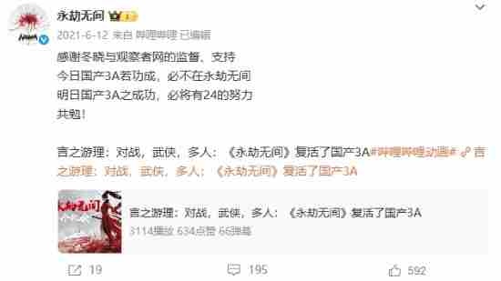 而就在今天中午,同属24工作室的《永劫无间》官方发文向《归唐》表示祝贺。