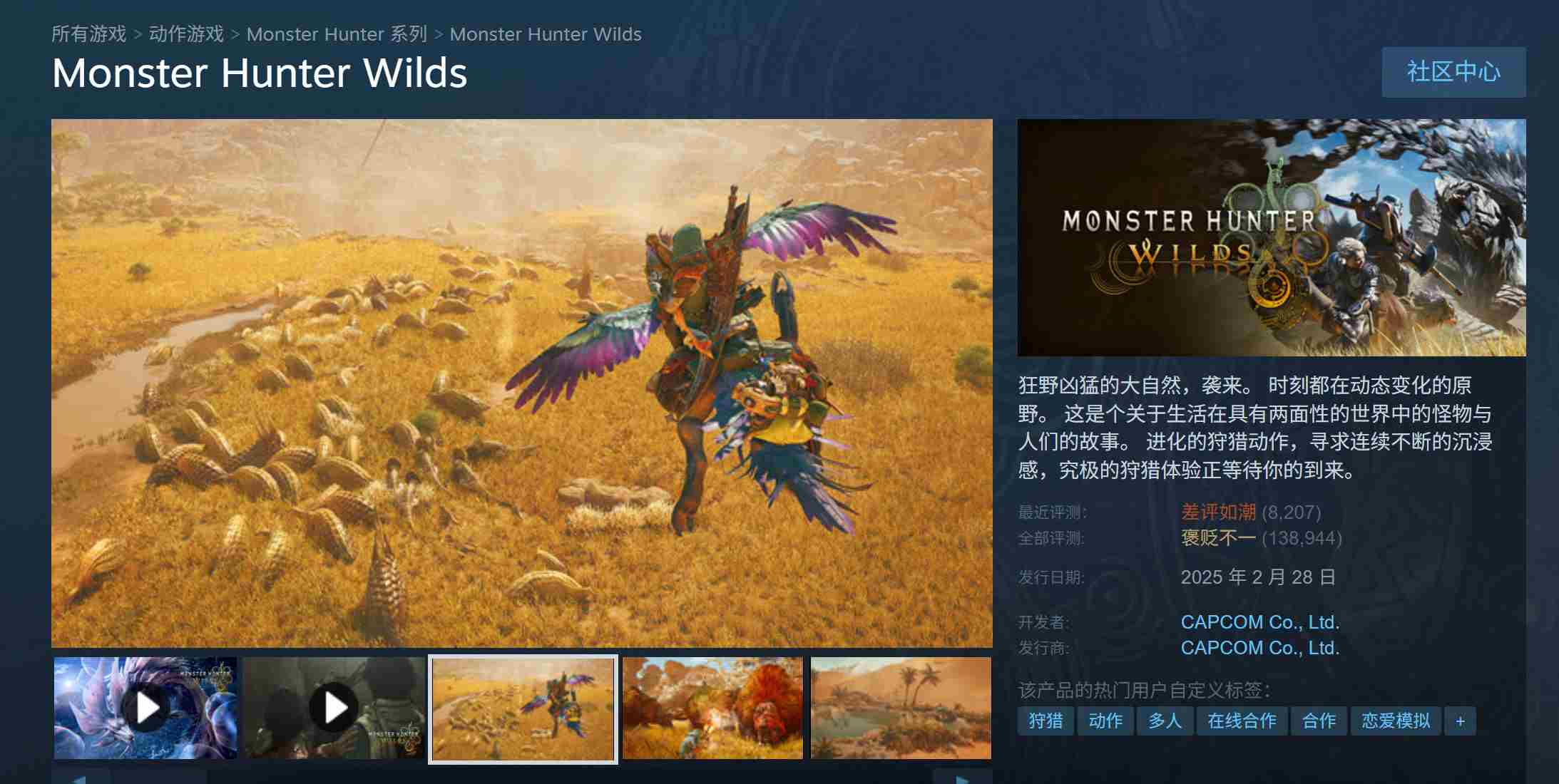 自《怪物猎人荒野》上市以来,这款游戏以其独特的魅力吸引了无数玩家,Steam在线人数峰值高达138万,首月销量更是惊人地突破1000万份。但好景不长,近期游戏评测遭遇滑铁卢,好评率骤降至区区19%,玩家反馈意见潮水般涌来,好评如潮变成了差评如潮。面对这样的局面,不禁让人思考,究竟是什么导致了这样的转变?对于那些仍在犹豫是否加入狩猎行列的玩家,或许在深入了解游戏现状后再做决定会更明智。