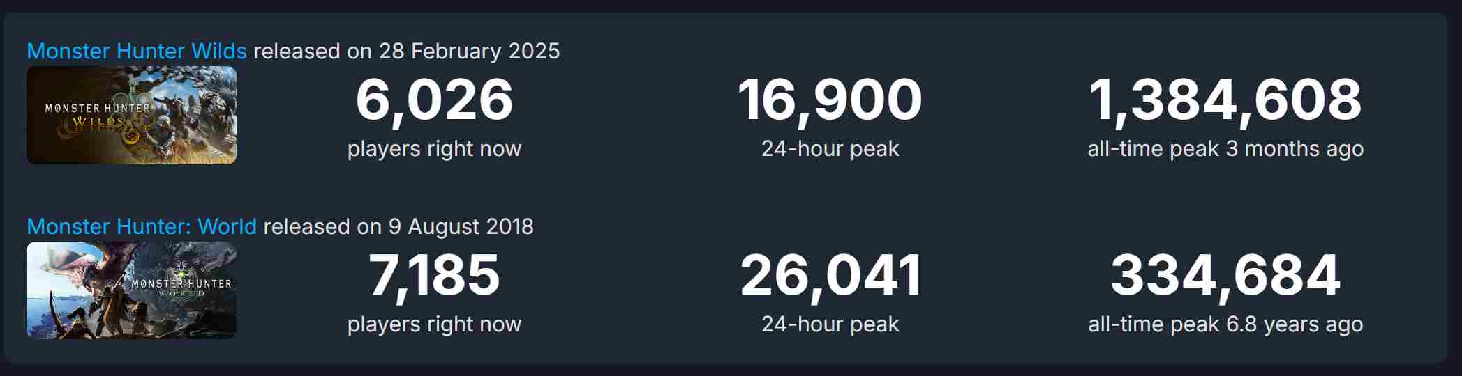 据Steamdb数据,前者Steam当前在线6026人,后者达到了7185人。而在24小时峰值方面,《怪物猎人:荒野》16900在线玩家也不及《怪物猎人:世界》的26041人。