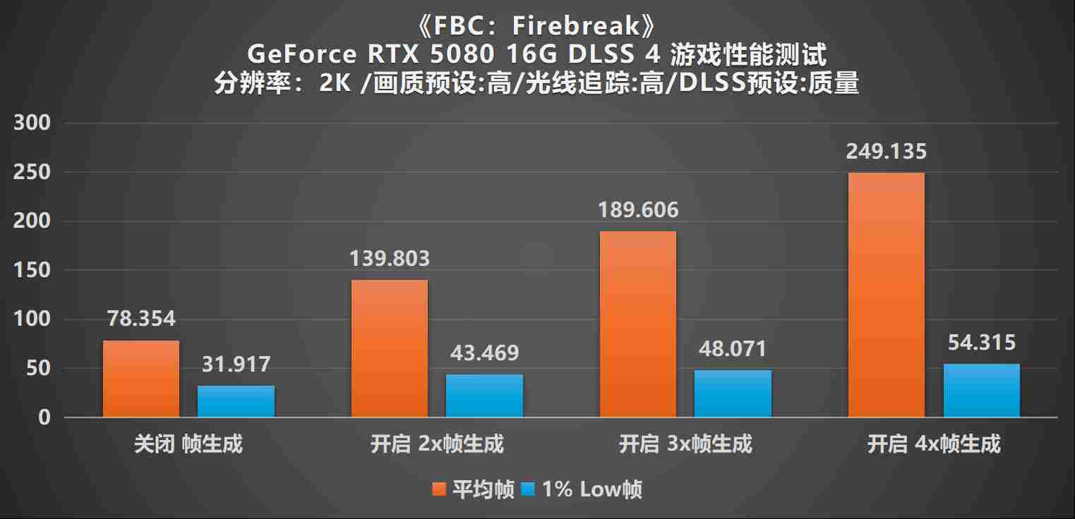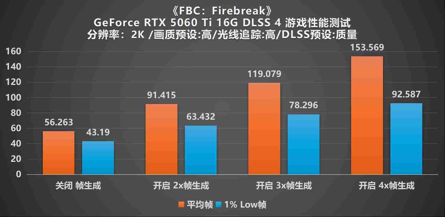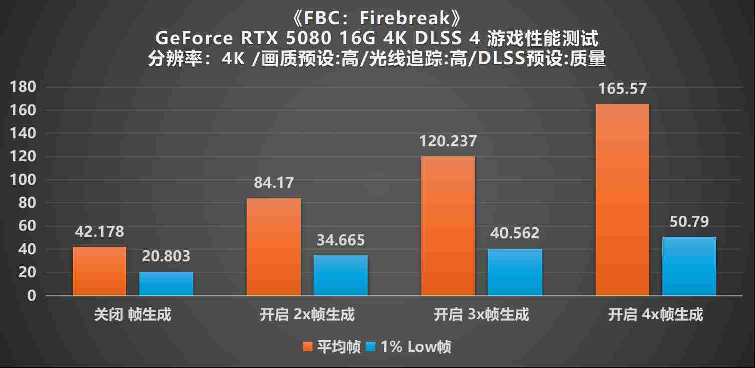 让我们重点看看这张RTX 5080在《Firebreak》4K分辨率下的表现。作为当下主流游戏的顶级画质标准,4K对显卡性能的压榨可谓毫不留情。在我们这套中高端测试平台上,关闭DLSS时,RTX 5080 16G的平均帧数仅有42帧,确实难以称得上流畅体验。但NVIDIA最新的DLSS 4技术再次展现了它的魔力,只需开启2X性能档位,游戏帧数就实现了翻倍增长,平均84帧配合34帧的1% Low帧表现,已经能提供相当顺滑的游戏体验。而当我们进一步开启3X、4X多帧生成功能时,最高帧数更是突破了166帧大关,相比原生渲染提升了惊人的295%,这样的性能增幅实在令人叹服。