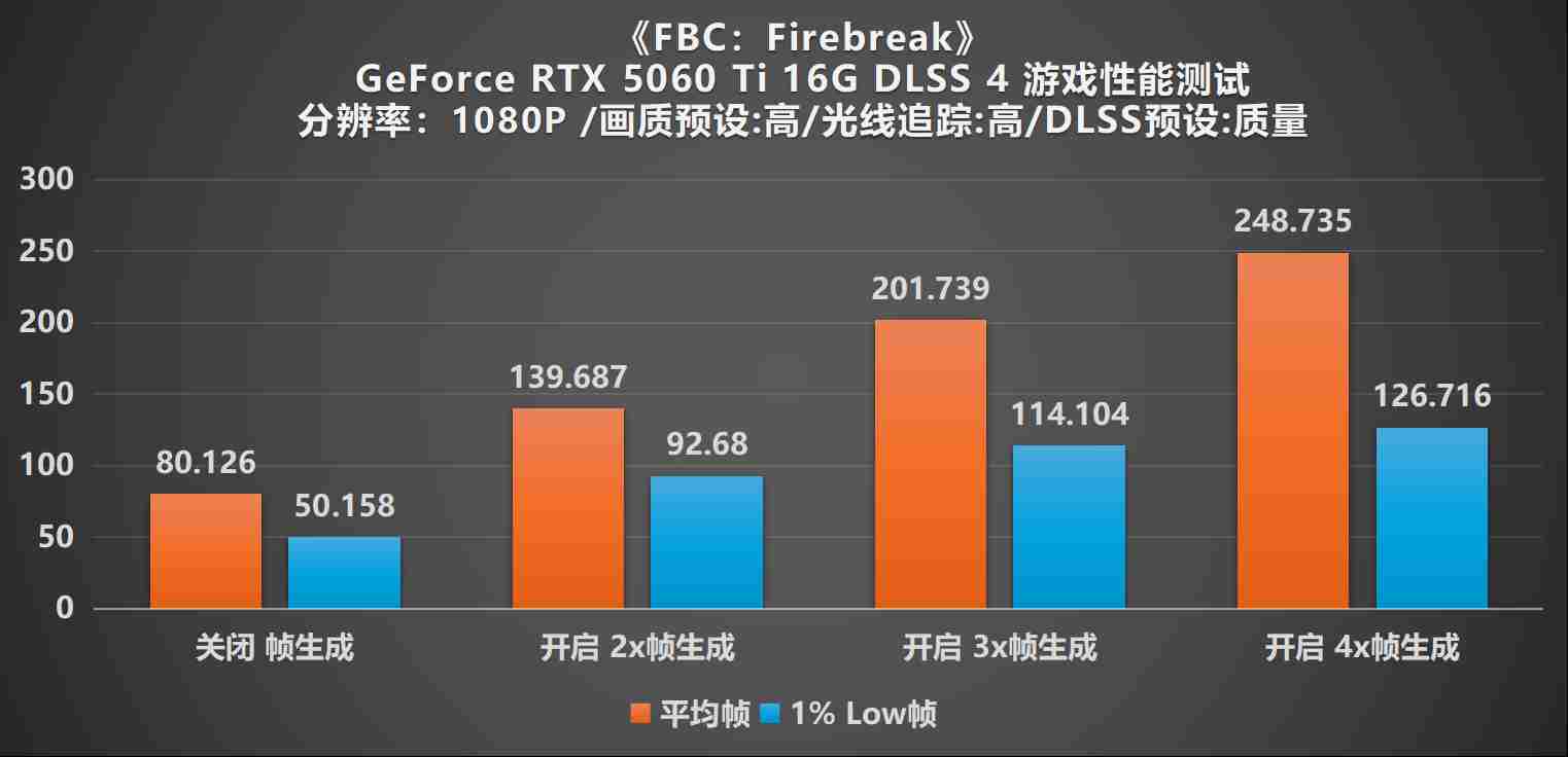 在游戏实测环节,我们首先考察了RTX 5060 Ti 16GB在1080P分辨率下的表现。令人惊喜的是,在不开启DLSS 4,仅使用原生渲染的情况下,游戏帧数就达到了80帧,足见游戏优化相当到位。开启DLSS 4后,即便只是选择2x帧生成档位,帧数就飙升至140帧,1%最低帧也显著提升。当我们继续调高至3x、4x多帧生成档位时,游戏帧数更是突破了200帧大关,最终定格在249帧,相比原生渲染提升了惊人的211%。