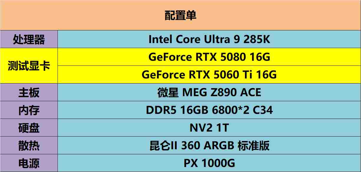 我们本次测试采用了英特尔Core Ultra 9 285K处理器搭配微星MEG Z890 ACE主板的组合,并选用了GeForce RTX 5080 16GB高端显卡和GeForce RTX 5060 Ti 16GB中端显卡进行对比测试,以此搭建了一套高性能PC测试平台。这样的配置组合能够有效避免系统瓶颈,确保测试结果的准确性,具体配置详情请参见上图。