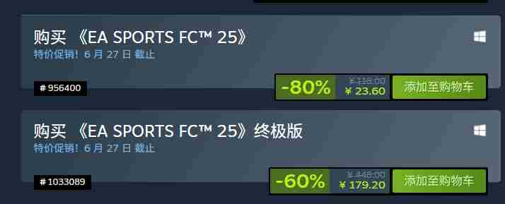 热门体育竞技游戏《EA Sports FC 25》目前在Steam平台上迎来惊喜促销,原价118元的游戏现以2折优惠,仅需23.6元即可入手。但这机会稍纵即逝,折扣仅持续至6月27日。想要体验极致足球盛宴的玩家,千万不要错过这个难得的机会!