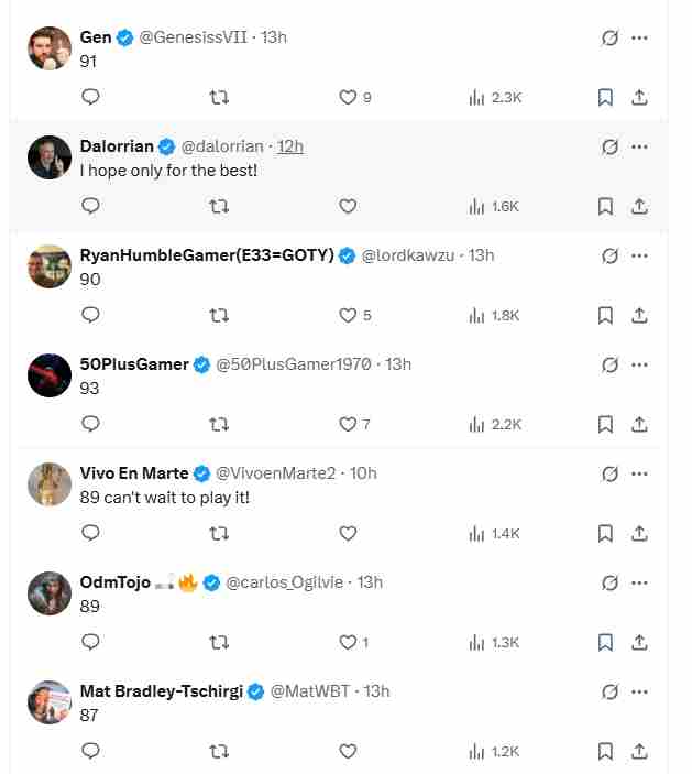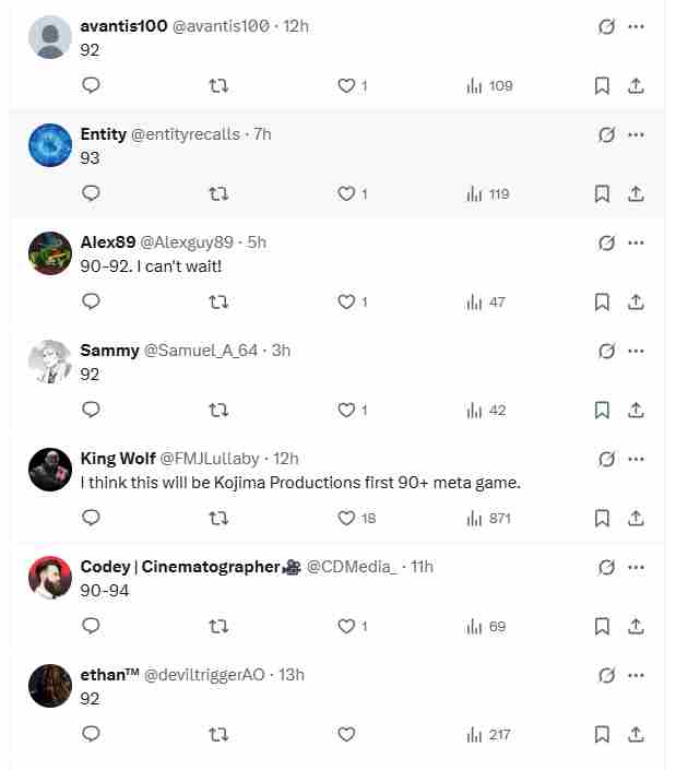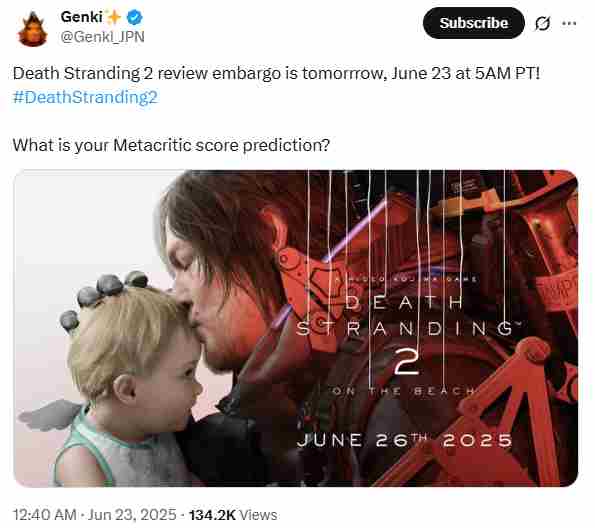 备受期待的《死亡搁浅2》即将在6月26日与玩家见面。就在今天,知名游戏博主@Genki_JPN在社交平台上发起了关于游戏Metacritic评分的预测讨论,激发了一轮热情的猜测潮。今晚8点,媒体评分揭晓,不妨来预测一下,这款小岛秀夫的最新力作能否获得满堂彩?敬请期待,一同见证这一时刻。